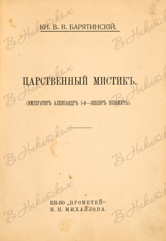 Барятинский, В.В., кн. Царственный мистик. (Император Александр 1-й — Феодор Кузьмич). СПб.: Кн-во «Прометей» Н.Н. Михайлова, [191-?].