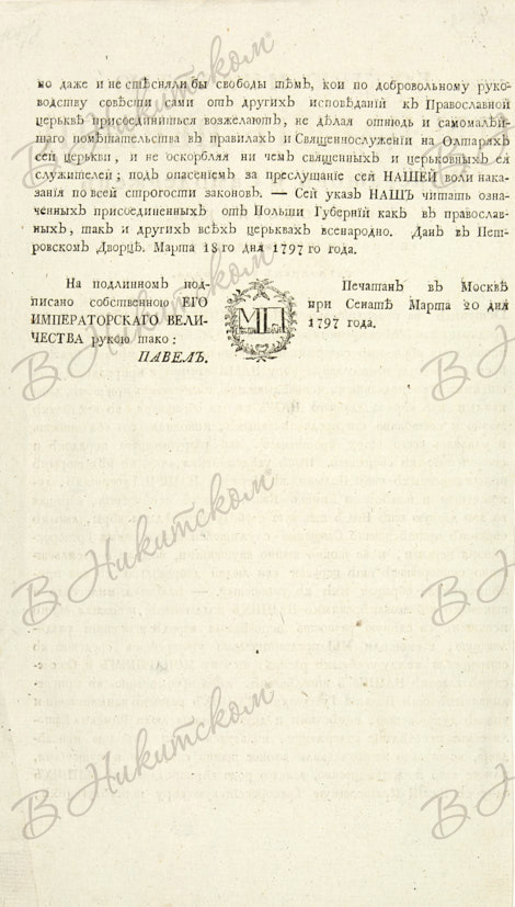 Указ Павла I о непритеснении греко-российской православной веры в присоединенных от Польши губерниях. 18 марта 1797. М.: Печатан при Сенате, 1797.