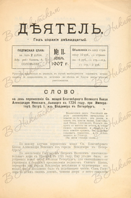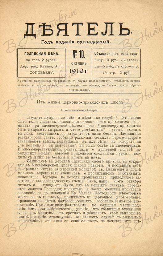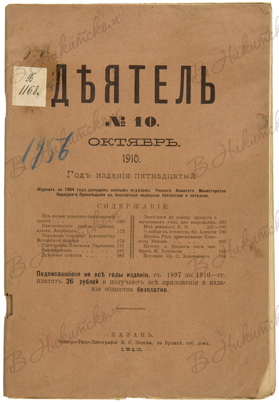 [Журнал Казанского Общества Трезвости]. Деятель. № 13 (1902), № 11 (1907), № 10 (1910). Казань: Типо-лит. Императорского Университета, 1902-1910.