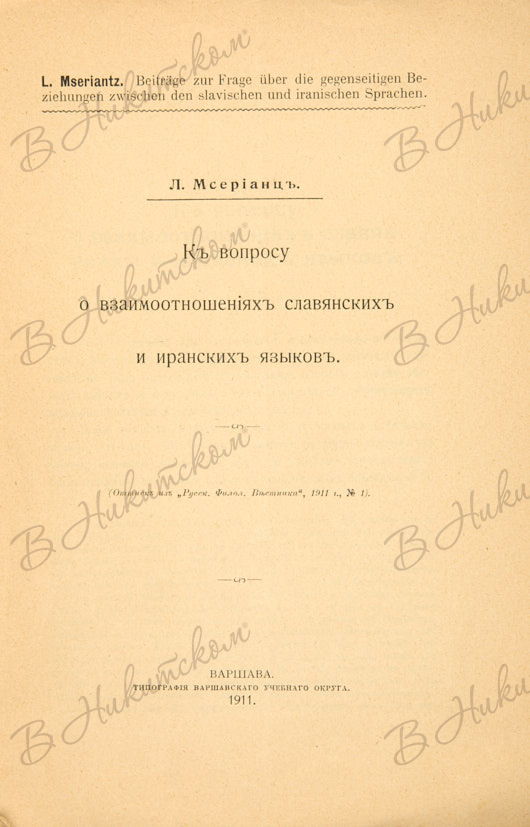 Мсерианц, Л. К вопросу о взаимоотношениях славянских и иранских языков. Варшава: Тип. Варшавского Учебного Округа, 1911.