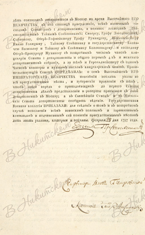 Высочайший указ о присутствии в Москве Синода, митрополита московского Платона, архиепископа казанского Амвросия и тверского Иринея [и др.] для коронации их величеств Павла I и Марии Федоровны. Б.м., 1797.
