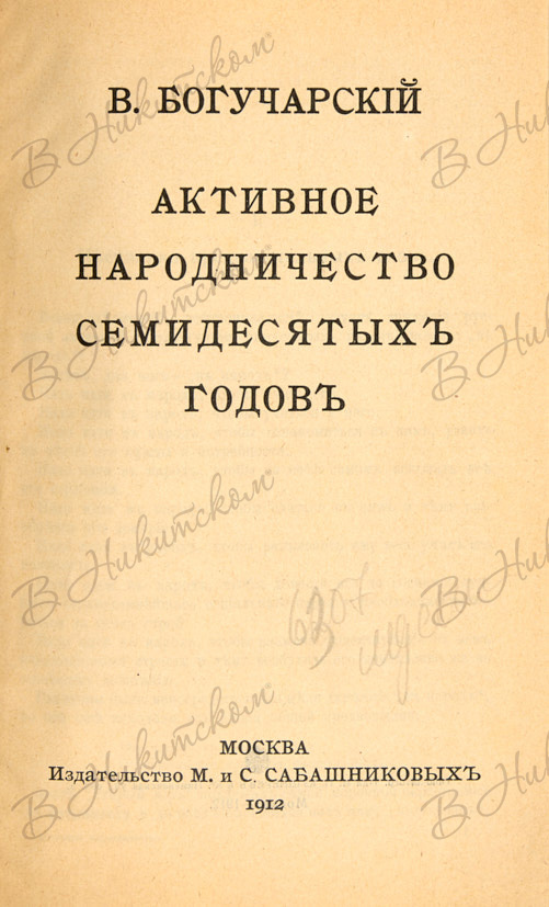 Богучарский, В. Активное народничество семидесятых годов. М.: Издательство М. и С. Сабашниковых, 1912.