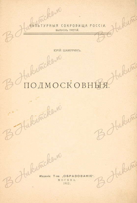 Шамурин, Ю. Подмосковные. (Культурные сокровища России; вып. 3). [В 2 ч. Ч. 1]. М.: Образование, 1912.