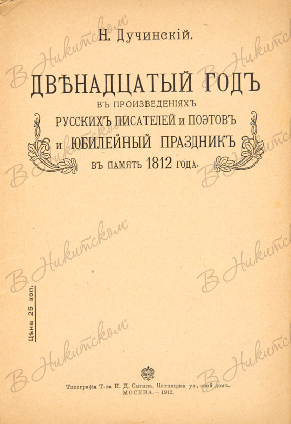Дучинский, Н.П. Двенадцатый год в произведениях русских писателей и поэтов и юбилейный праздник в память 1812 года. М.; СПб.: Т-во И.Д. Сытина, книгоиздательство «Сельского вестника», 1912.