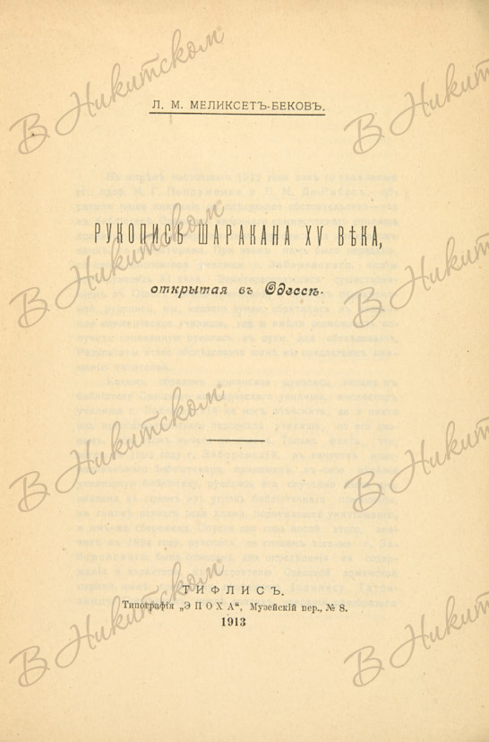 Меликсет-Беков, Л.М. Рукопись Шаракана XV века, открытая в Одессе. Тифлис: Типография «Эпоха», 1913.