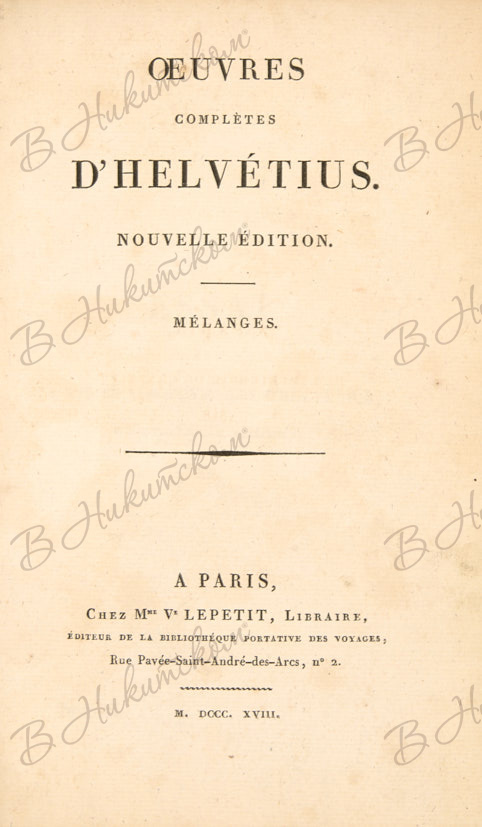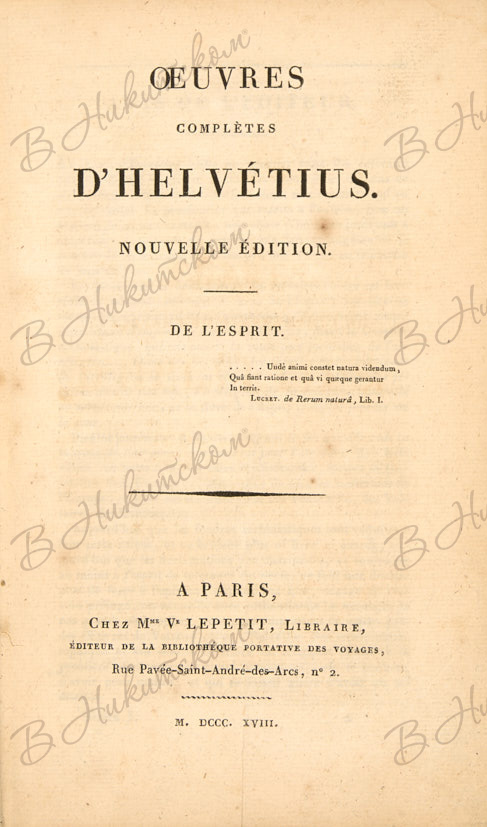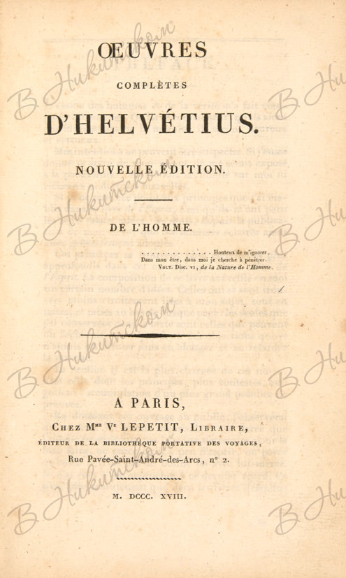 [Полное собрание сочинений Гельвеция]. Oeuvres completes d'Helvetius. [В 3 т.?] T. 1-3. Paris: Chez Mme Ve Lepetit, 1818.