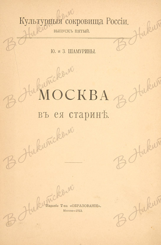 Шамурины, Ю. и З. Москва в ее старине. (Культурные сокровища России; вып. 5). М.: Образование, 1913.