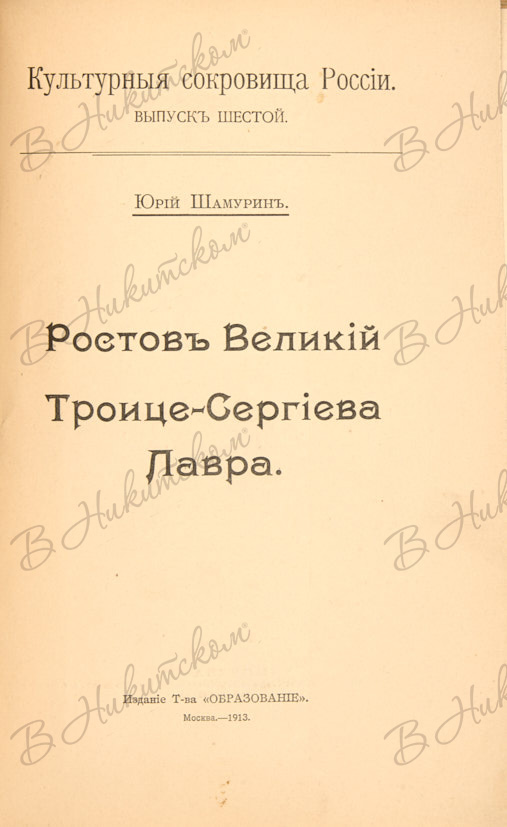 Шамурин, Ю.И. Ростов Великий. Троице-Сергиева лавра. (Культурные сокровища России; вып. 6). М.: Образование, 1913.