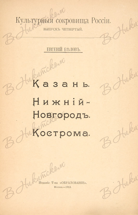 Белов, Е. Казань. Нижний Новгород. Кострома. (Культурные сокровища России; вып. 4). М.: Образование, 1913.