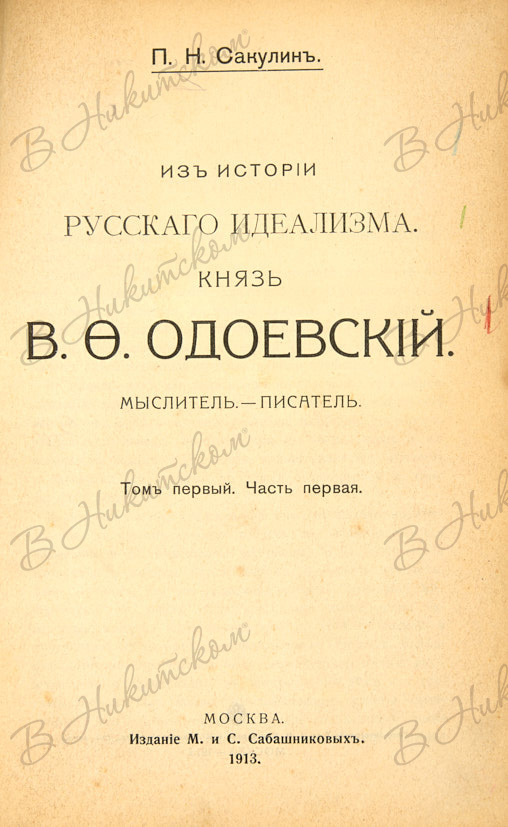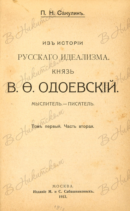 Сакулин, П.Н. Из истории русского идеализма. Князь В.Ф. Одоевский. Мыслитель. Писатель. Т. 1 [и единств.], ч. 1-2. М.: Изд. М. и С. Сабашниковых, 1913.