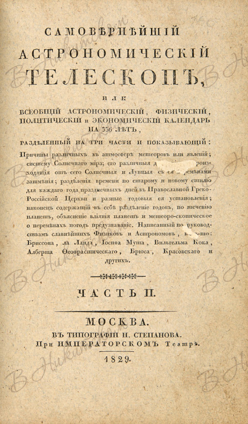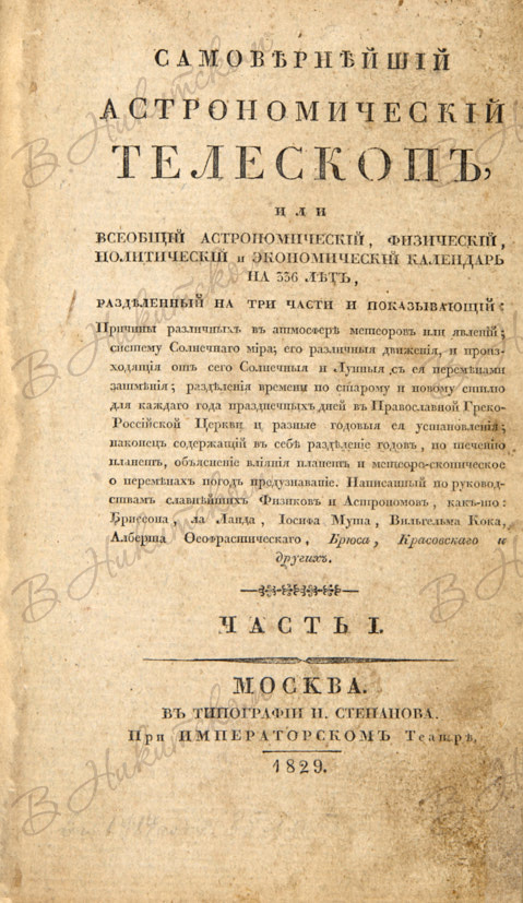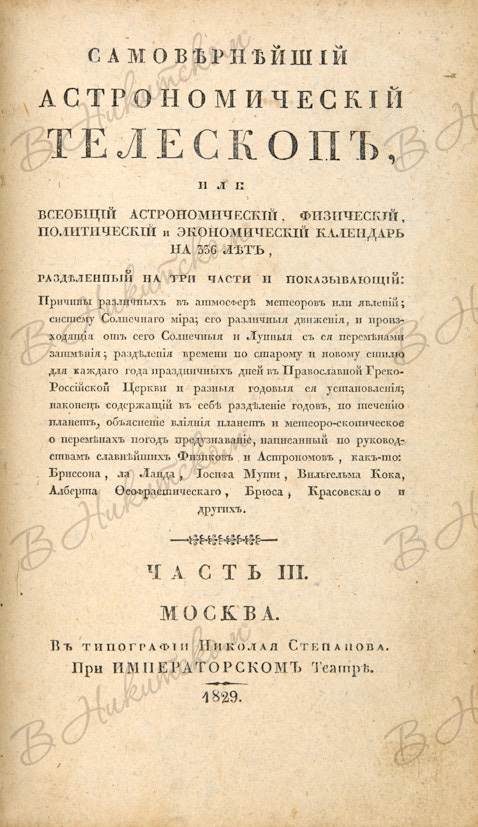 Бранкевич, М.С. Самовернейший астрономический телескоп, или Всеобщий астрономический, физический, политический и экономический календарь на 336 лет / написанный по руководствам славнейших физиков и астрономов, как-то: Бриссона, ла Ланда, Иосифа Мута [и др.] В 3 ч. Ч. 1-3. М.: Тип. Н. Степанова при Имп. театре, 1829.