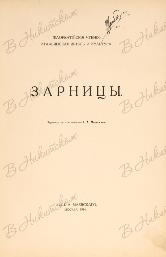 Зарницы. (Флорентийские чтения. Итальянская жизнь и культура; т. 1) / пер. с итал. И.А. Маевского. М.: И.А. Маевский, 1914.
