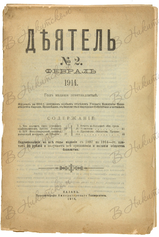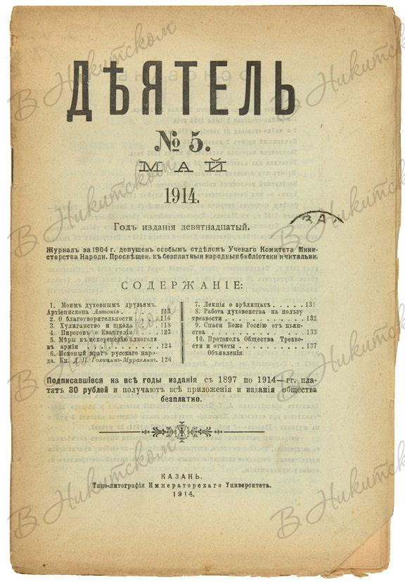 [Журнал Казанского Общества Трезвости]. Деятель. № 2, 5, 7, 8. Казань: Типо-лит. Императорского Университета, 1914.