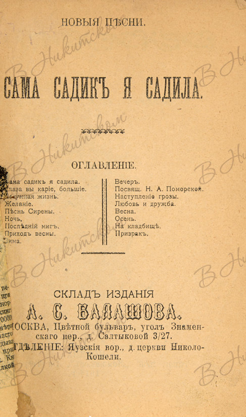 Сама садик я садила. Новые песни. М.: Склад издания А.С. Балашова, 1914.