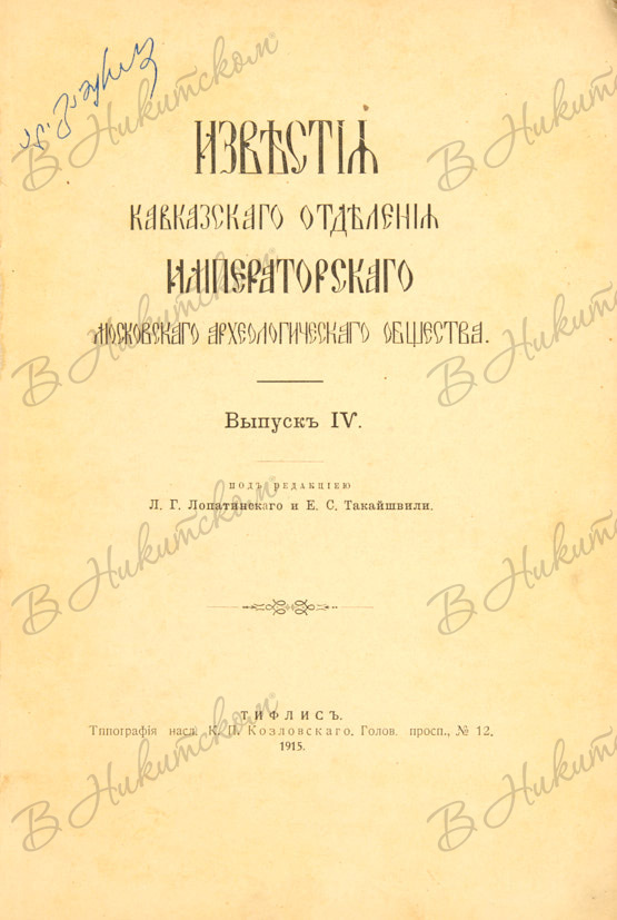 Известия Кавказского отделения Императорского Московского Археологического Общества. Вып. IV / под ред. Л.Г. Лопатинского и Е.С. Такайшвили. Тифлис: Типография насл. К.П. Козловского, 1915.