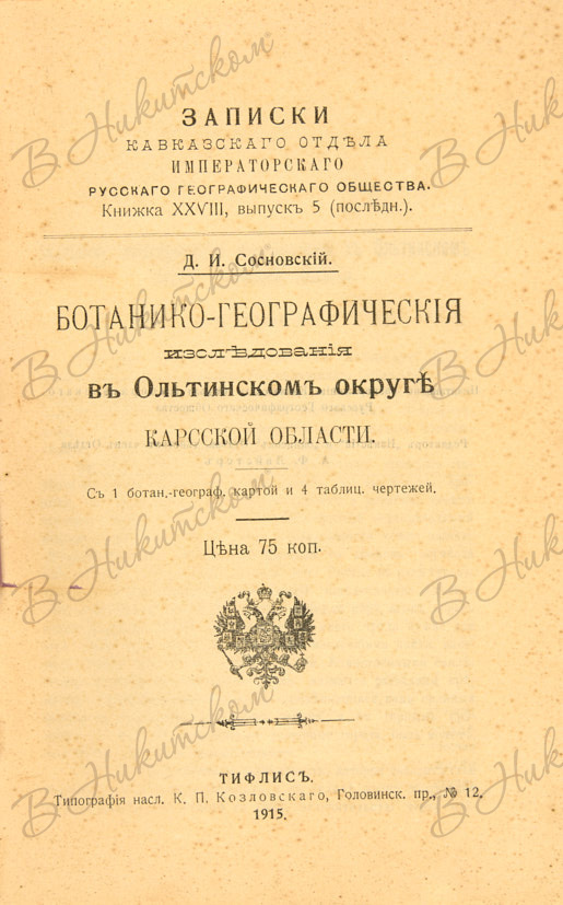 [Записки Кавказского отдела Императорского Русского Географического Общества. Кн. XXVIII, вып. 5 (последн.)] Сосновский, Д.И. Ботанико-географические исследования в Ольтинском округе Карсской области / С 1 ботан.-геогр. картой и 4 табл. черт. Тифлис: Тип. насл. К.П. Козловского, 1915.