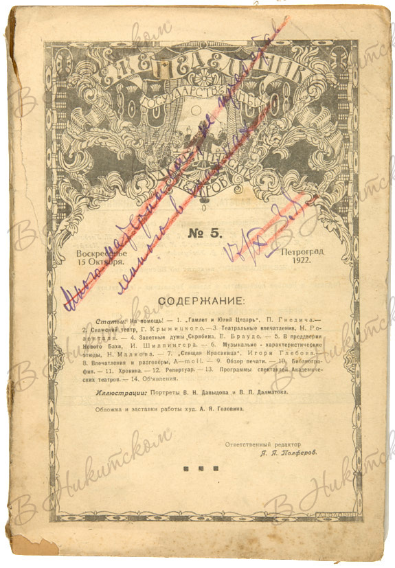 3. Еженедельник государственных академических театров. № 5 за 1922 г. Пг.: Тип. Культ-Отдела Совета Союзов, 1922. 43, [1], 12 с., 2 л. рекл., ил. 24,8 х 17 см. В иллюстрированной орнаментированной издательской обложке. Надпись фиолетовыми чернилами, зачеркнутая красным карандашом на лицевой сторонке обложки. Пометы красным карандашом в тексте. Небольшие загрязнения обложки, надрыв лицевой сторонки, утрата фрагментов обложки и корешка. Тираж 3000 экз.