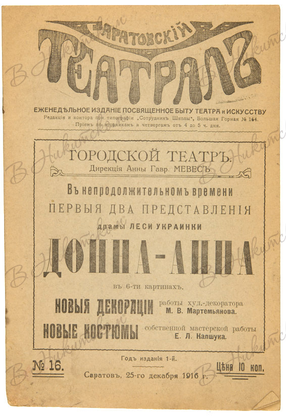 1. Саратовский театр. № 15 за 1916 г. Саратов: Тип. «Сотрудник школы», 1916. 3 л. рекл., 7, [1] с., ил. 23,5 х 16 см. В издательской обложке. Следы выцветания обложки, потертости. Блок чистый.
