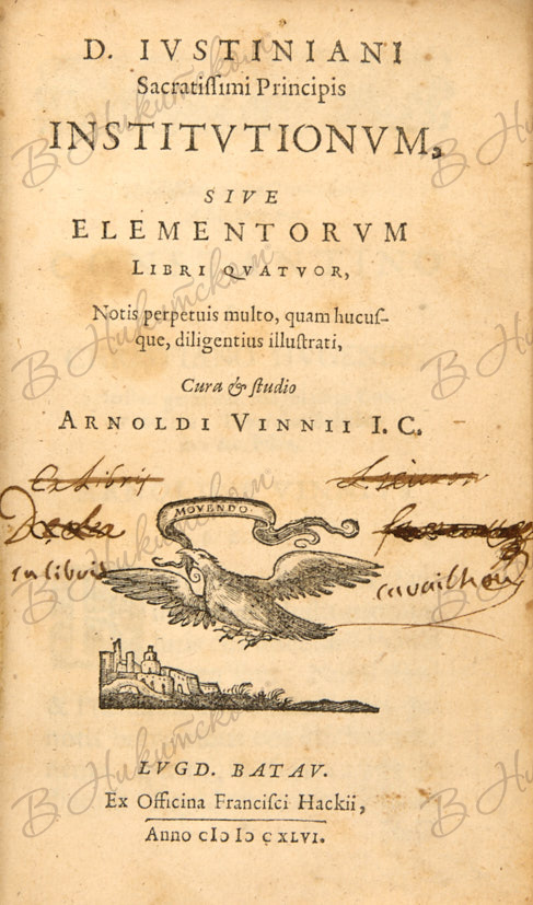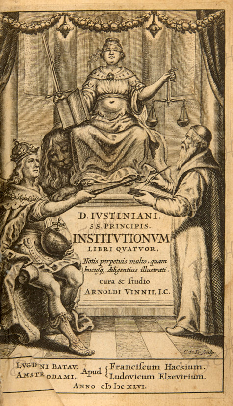 [Эльзевир]. [Юстиниан. Институции. Книга четвертая]. D. Justiniani, Sacratissimi Principis, Institutionum Sive Elementorum Libri Quatuor, notis perpetuis multo quàm hucusque diligentius illustrati. Cura ac studio Arnoldi Vinnii. Lugd. Batav. [Лейден]: Ex Officina Francisci Hackii, 1646.