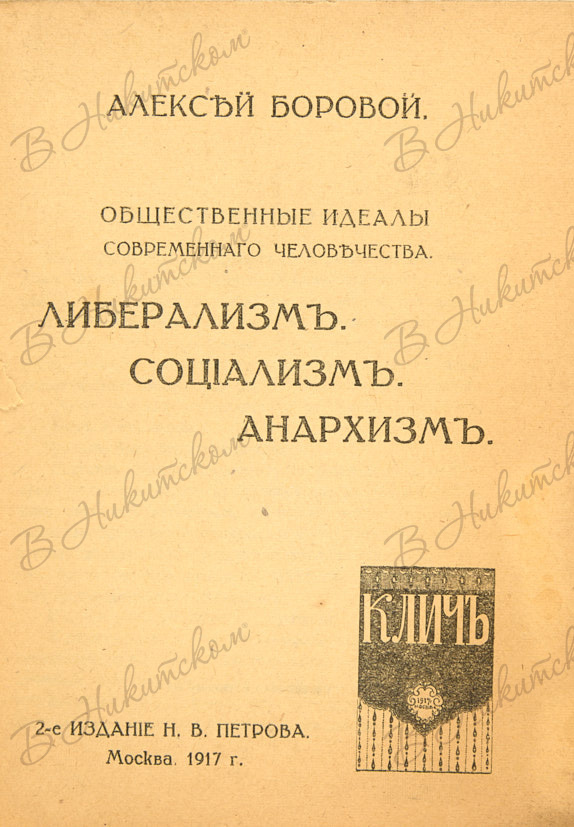Боровой, А.А. Общественные идеалы современного человечества. Либерализм. Социализм. Анархизм. 2-е изд. М.: Н.В. Петров, 1917.