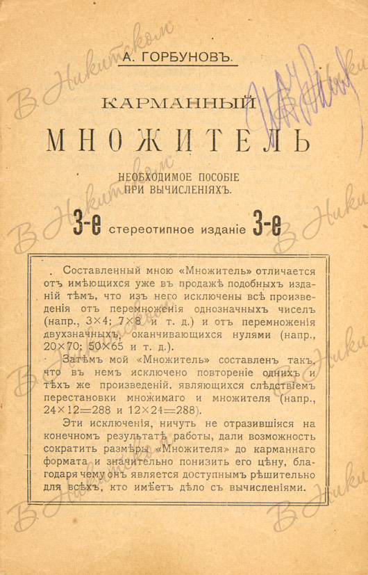 Горбунов, А. Карманный множитель: Необходимое пособие при вычислениях. Пг.: Тип. М.К Ивановского, 1917.