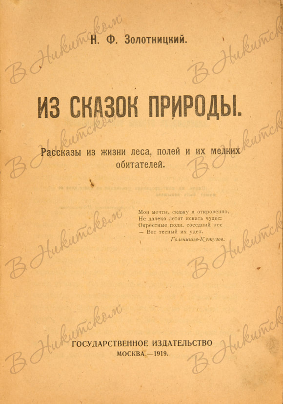 Золотницкий, Н.Ф. Из сказок природы. Рассказы из жизни леса, полей и их мелких обитателей. М.: Государственное издательство, 1919.