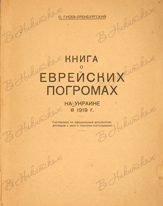 Гусев-Оренбургский, С. Книга о еврейских погромах на Украине в 1919 г. / сост. по официальным документам, докладам с мест и опросам пострадавших. Пг.: Изд. З.И. Гржебина, [1920-е].