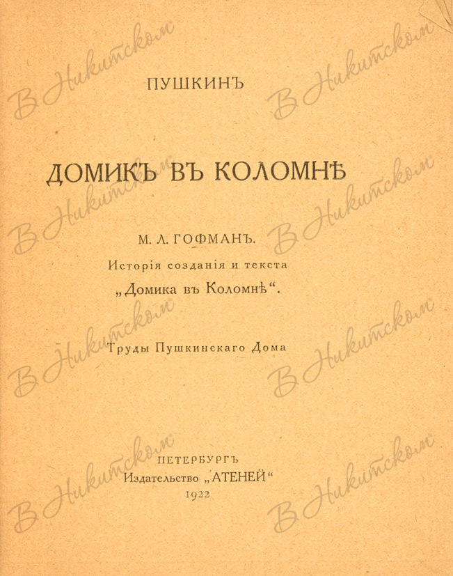 Гофман, М. Пушкин. Домик в Коломне. История создания и текста. Пб.: Издательство «Атеней», 1922.