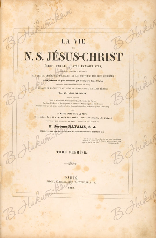 [Жизнь Господа нашего Иисуса Христа, написанная четырьмя евангелистами]. Natalis, S.J., Brispot, P.F.L. La vie de N.S. Jesus-Christ ecrite par les quatre evangelistes. [В 2 т.] T. 1. Paris: Pilon, 1853.