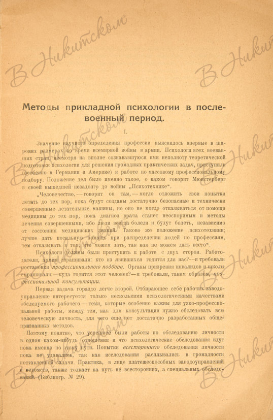 Шпильрейн, И.Н. I. Методы прикладной психологии в послевоенный период. II. Лаборатория промышленной психотехники при Народном комиссариате труда (год работы). (Серия «Работы Лаборатории промышленной психотехники НКТ СССР» / под общ. ред. И.Н. Шпильрейна; вып. 1). М.: Вопросы труда, 1924.