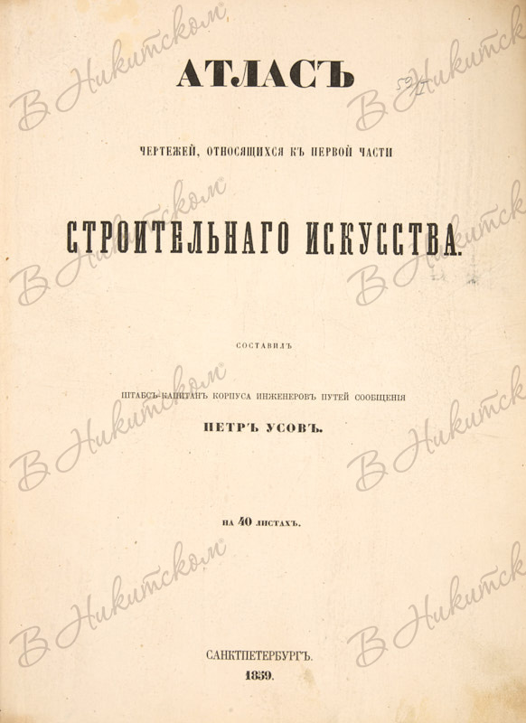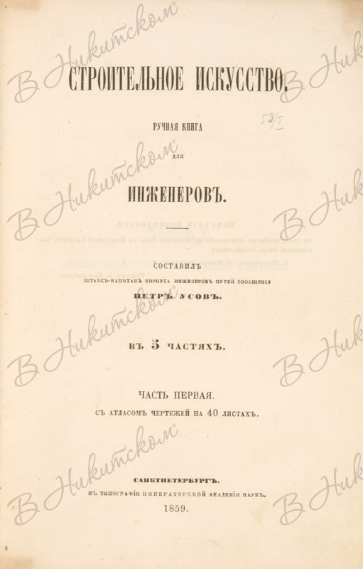 Усов, П. Строительное искусство. Ручная книга для инженеров. В 5 ч. Ч. 1: С Атласом чертежей на 40 листах. СПб.: В Тип. Императорской Академии наук, 1859.