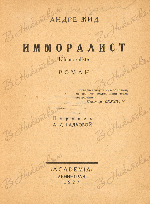 Жид, А. Собрание сочинений. [В 3 т.]. Т. 1. Имморалист / обл. В. Ходасевич. Л.: Академия, 1927.