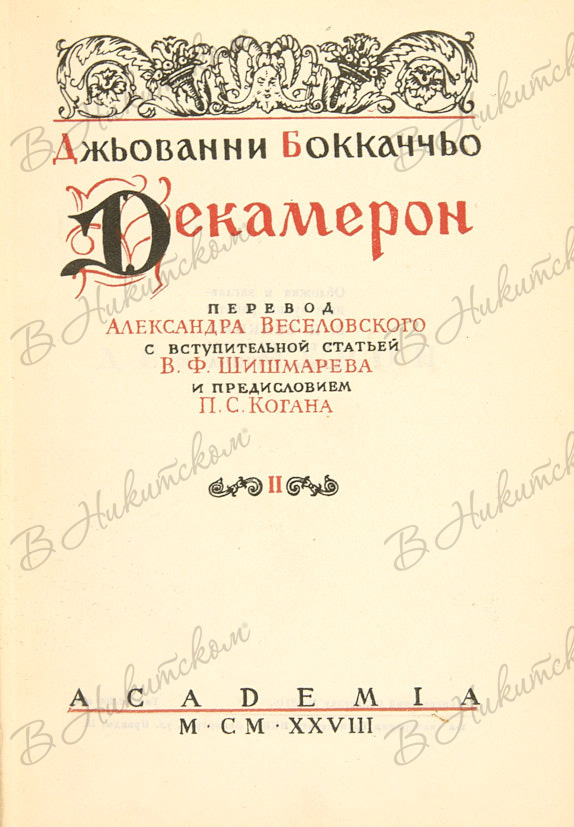Бокаччо, Дж. Декамерон / перевод Александра Веселовского с вступ. Статьей В.Ф. Шишмарева и пред. П.С. Когана. [В 2 т.]. Т. 2. Л.: Academia, 1928.