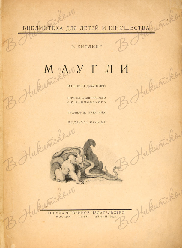 Маугли. Из Книги джунглей / рис. В. Ватагина; пер. С.Г. Займовского. 2-е изд. М.; Л.: Госиздат, 1928.