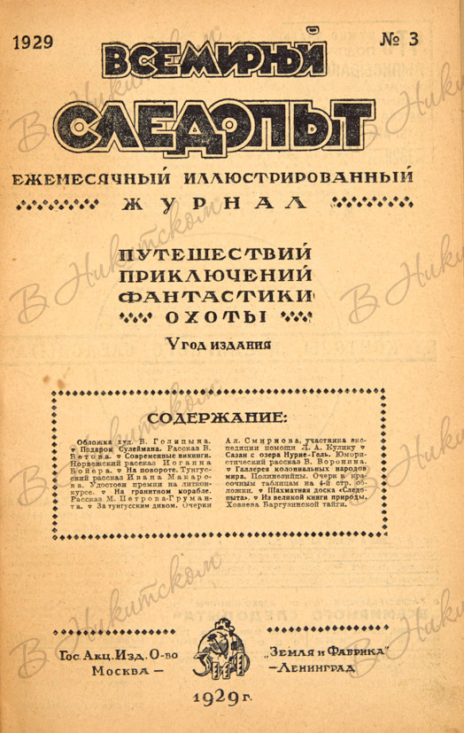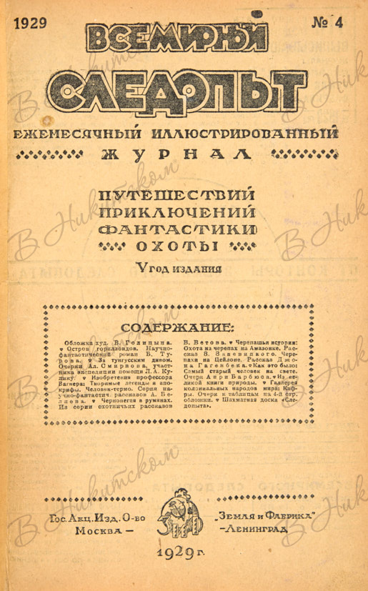 [Годовой комплект]. Всемирный следопыт. Ежемесячный иллюстрированный журнал путешествий, приключений, фантастики, охоты. № 1-12. М.- Л., Изд. ЗИФ, 1929.