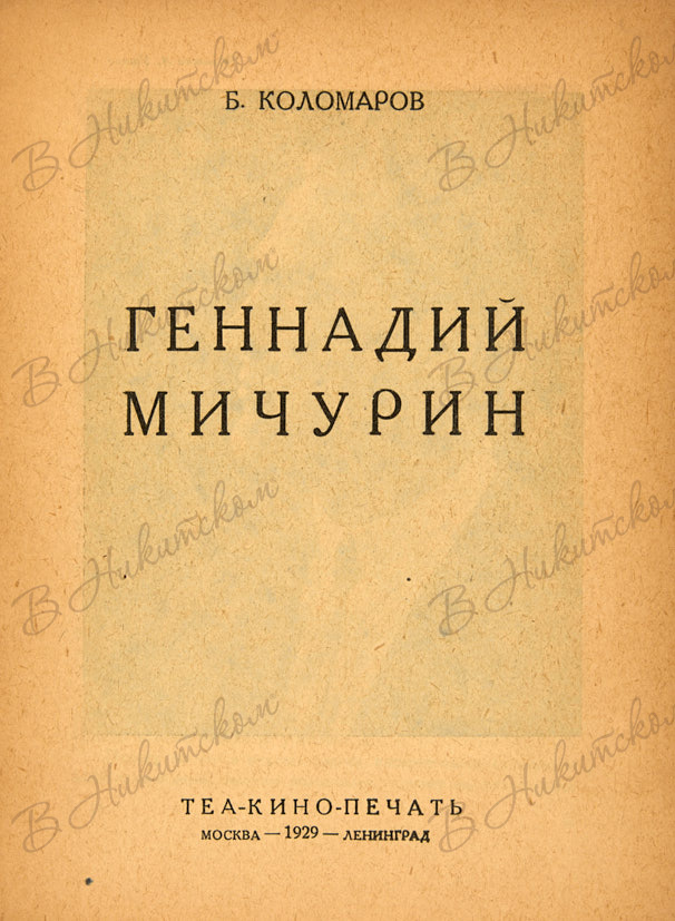 Коломаров, Б. Геннадий Мичурин. М., Л.: Теакинопечать, 1929.