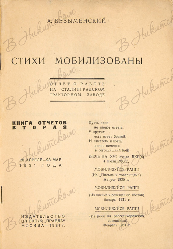 Безыменский, А.И. Стихи мобилизованы. Отчет о работе на Сталинградском тракторном заводе. Книга отчетов вторая. 28 апр. – 28 мая 1931 г. М.: Издательство ЦК ВКП(б) «Правда», 1931.