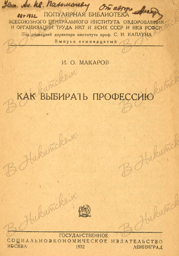 Макаров, И.О. [Автограф]. Как выбирать профессию. М.; Л.: Гос. Соц.-Эконом. Изд., 1932.