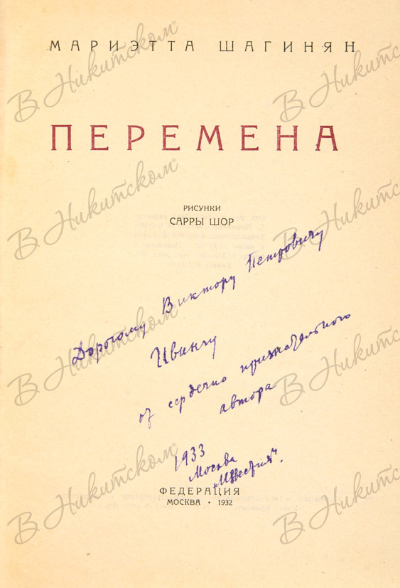 Шагинян, М. [Автограф]. Перемена / рис. С. Шор. М.: Федерация, 1932.