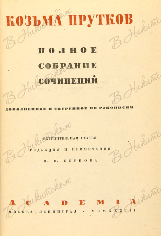 Прутков, К.П. Полное собрание сочинений. Дополненное и сверенное по рукописям / вступ. ст. ред. и прим. П.Н. Беркова; оформ. книги по рисункам Н. Кузьмина. М.; Л.: Academia, 1933.