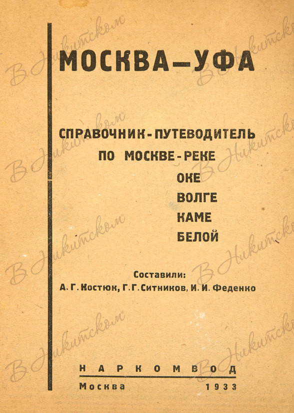Москва – Уфа. Справочник-путеводитель по Москве-реке, Оке, Волге, Каме, Белой / составили А.Г. Костюк, Г.Г. Ситников, И.И. Феденко. М.: НАРКОМВОД, 1933.
