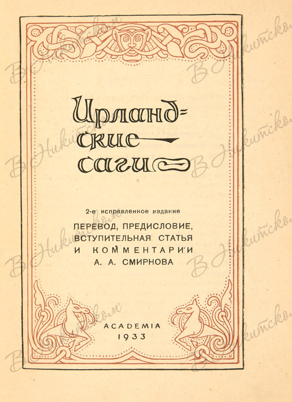 [Серия «Сокровища мировой литературы»]. Ирландские саги / перевод, пред., вступ. статья и коммент. А.А. Смирнова. Л.; М.: Academia, 1933.