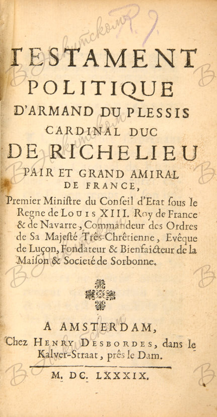 [Арман Жан дю Плесси, кардинал де Ришелье. Политическое завещание]. Testament politique d'armand du plessis cardinal duc de Richelieu. Amsterdam: Chez Henry Desbordes, 1689.