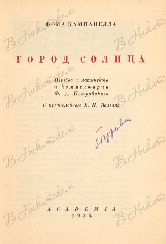 Кампанелла, Т. Город солнца / пер. с лат. и комм. Ф.А. Петровского, пред. В.П. Волгина, грав. на дереве Н.П. Дмитревского. М.; Л.: Academia, 1934.