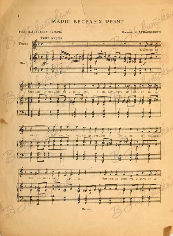 [Ноты]. Марш веселых ребят. Из фильма «Веселые ребята» Московского Кино-комбината / музыка И. Дунаевского; текст В. Лебедева-Кумача; исполняют Л. Утесов и Л. Орлова. М.: Международная книга, 1934.