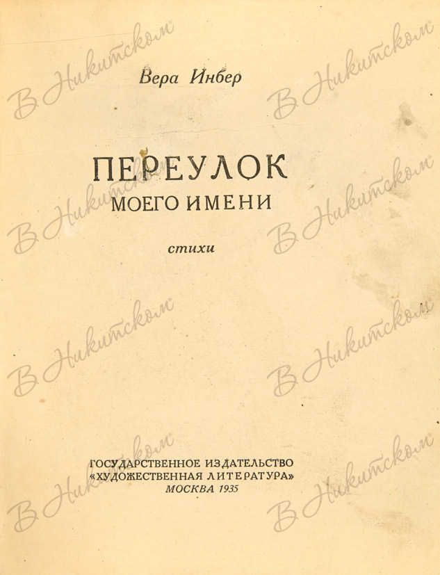 Инбер, В. Переулок моего имени. Стихи. М.: «Художественная литература», 1935.