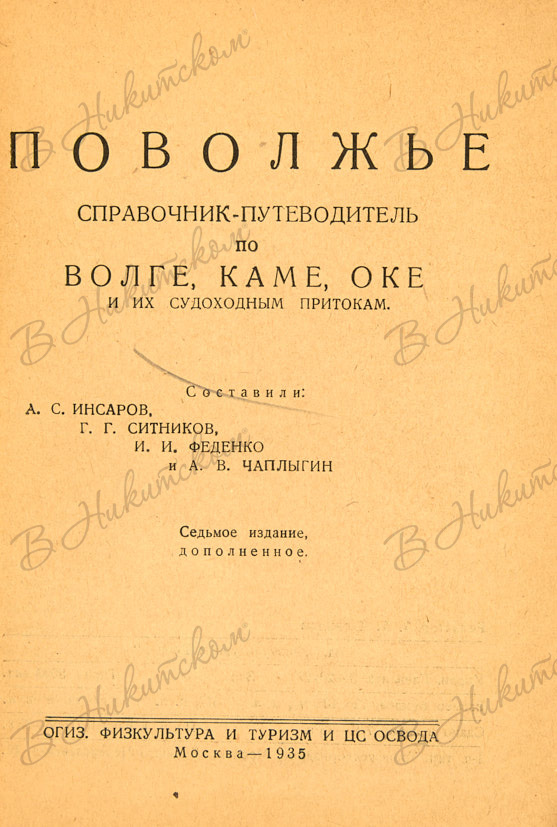 Поволжье. Справочник-путеводитель по Волге, Каме, Оке и их судоходным притокам / Составили А.С. Инсаров, Г.Г. Ситников, И.И. Феденко и А.В. Чаплыгин. 7-е издание, дополн. М.: ОГИЗ; Физкультура и туризм; ЦС ОСВОДА, 1935.