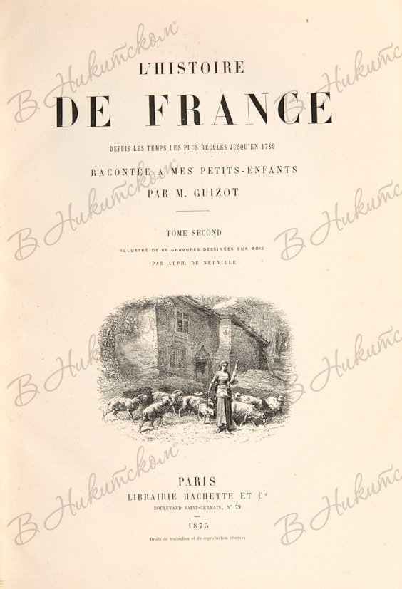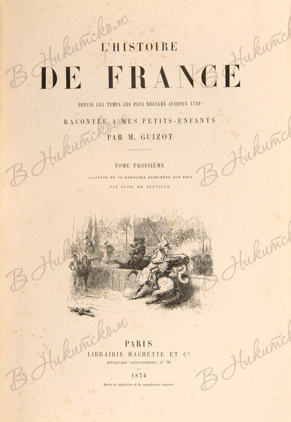 Т.5: [12] с., 599 с., ил. 2. Гизо, Ф. История Франции от 1789 до 1848 года. [Guizot, F. L'histoire de France depuis 1789 jusqu'en 1848]. В 2 т. Т.1-2. Париж: Librairie Hachette et Cie, 1878-1879.