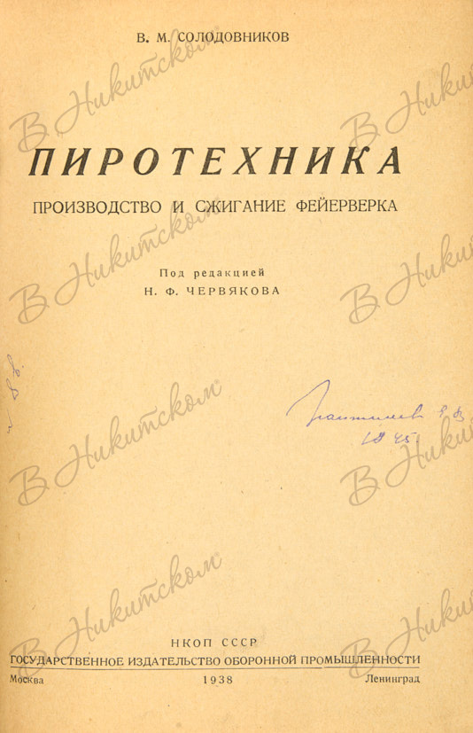 Солодовников, В.М. Пиротехника. Производство и сжигание фейерверка / под ред. Н.Ф. Червякова. М.; Л.: НКОП СССР, 1938.