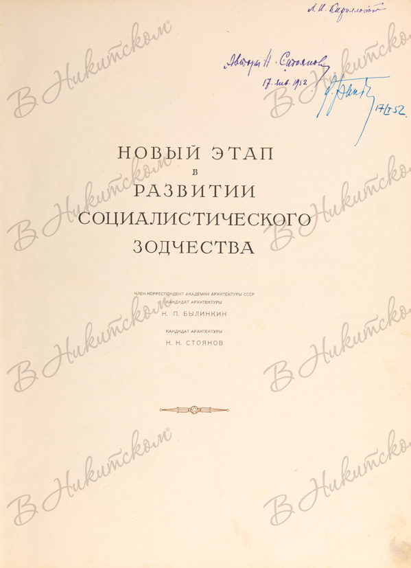 1. Быликин, Н.П., Стоянов, Н.Н. [Автографы]. Новый этап в развитии социалистического зодчества. 36 с., 3 л. ил.